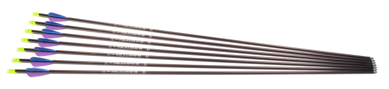 Second Hand Easton Jazz Arrows - 1214 - 26 2/4" - Set of 7Set of 7 Easton Jazz Arrows 1214 26 3/4" EP16 vanes 1 x Blue 2 x Purple Large Groove G Nocks - GreenMore Product Info