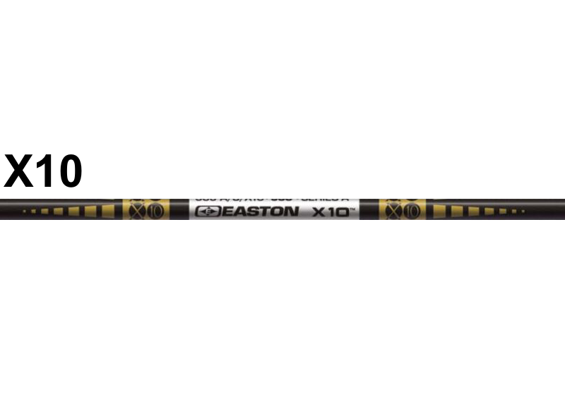 Easton X10 Shafts - DozenEaston x10 shafts, Easton's top-of-the-range shaft. A slightly heavier arrow with a very small diameter gives this shaft a high performance. The perfect 10 hands down. Small diameter barrelled profile resists wind drift better than any other type of arrow.
