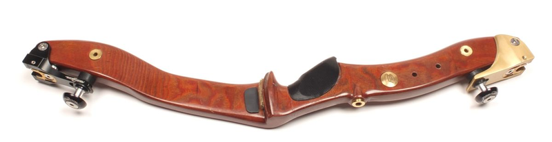 Second Hand FibreBow Fiberwood Riser ILF - RH 25"Not somethng that we often see This riser is made from laminate resin beech plywood cut to shape using a CNC machine, compatible with ILF Limbs, also all the holes are archery standard threads - for example 5/16th Pressure Button hole. The riser also has a second button hole to afix an arrow rest, or you can shot directly of the arrow shelf - how the bow has been used. It currently has the lighter weight alluminium top pocket attached, which is recommended for barebow use, you will see that riser also has with it the brass top pocket as well as the additonal supplied brass weights - 170grms. The riser has some marks on it, from use, we have given added some images showing a selection of those marks to give a general idea of the condition of the riser.