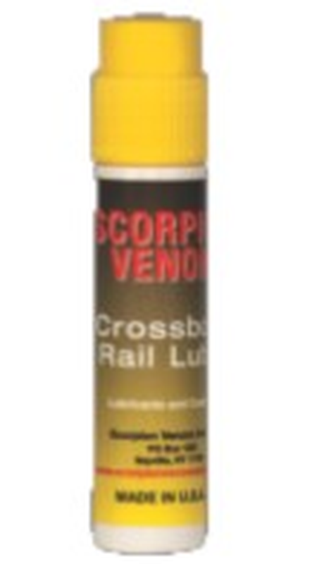 Scorpion Venom Archery Crossbow Rail LubeChemically composed to provide extreme slip without tac, the Scorpion Venom crossbow rail lube boasts a uniquely crafted formula that reduces friction, dampens noise, and extends rail life. No need to wax the serving making contact with the rail that would otherwise cause wax build-up, friction, and serving separation. Apply to the barrel of the crossbow; one or two passes are all you need using the mess-free applicator.