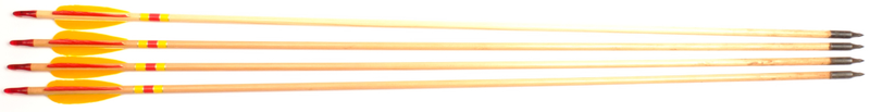 Second Hand Set of Four Wooden Arrows - Spined for 32.5 lbs - 32"Please be aware that, though all four of these arrows have been checked carefully, due to the nature of wooden arrows, they may have internal damage. This set of four arrows is in good condition, with their feathers practically untouched and nocks with little wear. The shaft length is 32 inches with the spine being rated at 32 and a half pounds. Red cock and yellow hen 3-inch parabolic feather vanes. More Product Info