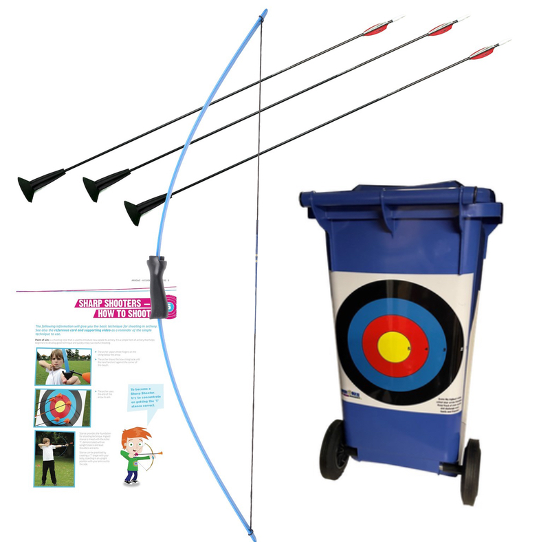 Arrows Archery Wheelie Bin KitOur Arrows Archery kits have been immensely popular over the years, the kits were originally designed to get Primary school children shooting from a young age by creating an easy and safe-to-use kit. Since its inception Arrows Archery has grown to encompass more than this including retirement homes, cruise ships and activity centres. We have seen more and more demand from individuals wanting their own kits to shoot at home. After the release of our home edition kit, we wanted to go further in designing a budget-friendly kit that everyone could use. The Wheelie bin kit utilises an adhesive-backed target face which allows you to attach the face to your wheelie bin which significantly reduces the cost of the kit by removing the need for a target. Arrows archery utilises a 10lbs bow and sucker arrows to ensure the kit can be used by all age groups. The Bow and Arrows are all from the standard kits. Please note this pack does not contain the Teachers Arrows Manual, just a Sharp Shooter reference card. For Schools or Youth Organisations, we recommend buying one of the full-size kits, which contains the Teacher's Manual as well as full-size targets. Wheelie bin Kit includes